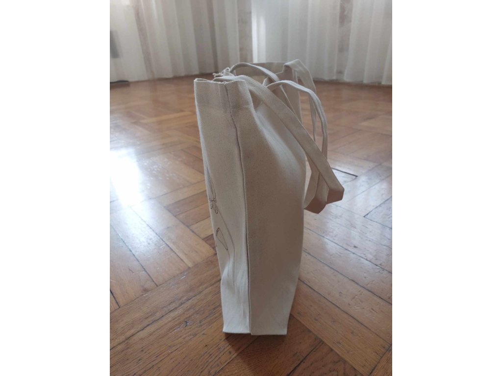 Materiál: 100% bavlnaBarva: režná s vínovým potiskemVelikost: š = 44 cm, v = 38 cm, h = 10 cm, délka ucha = 63 cm