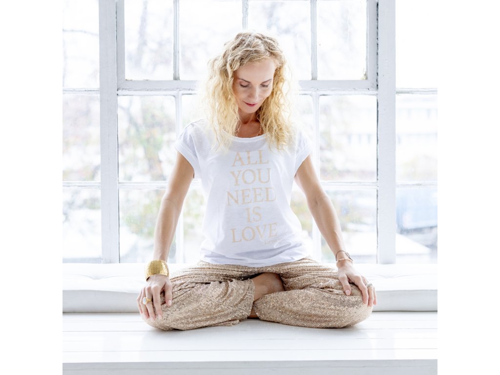 Dámské tričko se "spadlým" rukávkem, střih rovný, delší zadní díl, béžový potisk na předním díle ALL YOU NEED IS LOVE